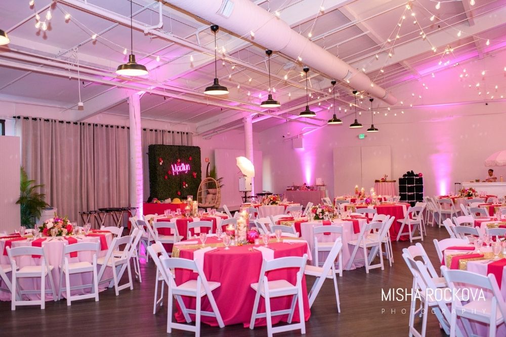 Elegant reception setup with market lights and pink uplighting at Julep wedding lighting design in San Diego