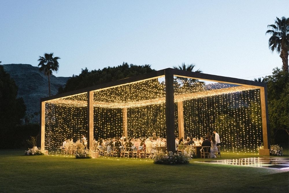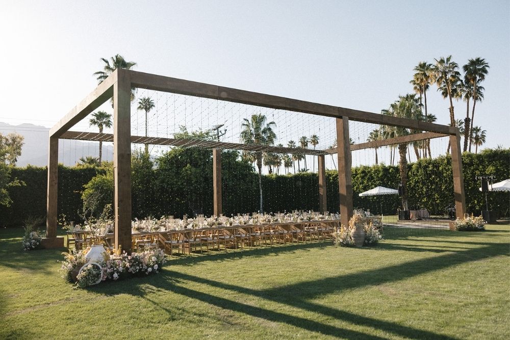 Parker Palm Springs wedding lighting with a wooden frame canopy and soft twinkle lights draped overhead, creating a romantic outdoor dining space on the lawn